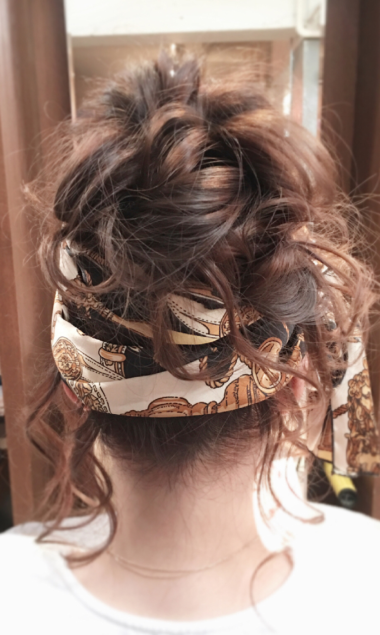 おだんごスカーフアレンジ☆さくっとまとめてスカーフを巻くだけの簡単スタイル☆無造作に落ちる後毛もポイント☆