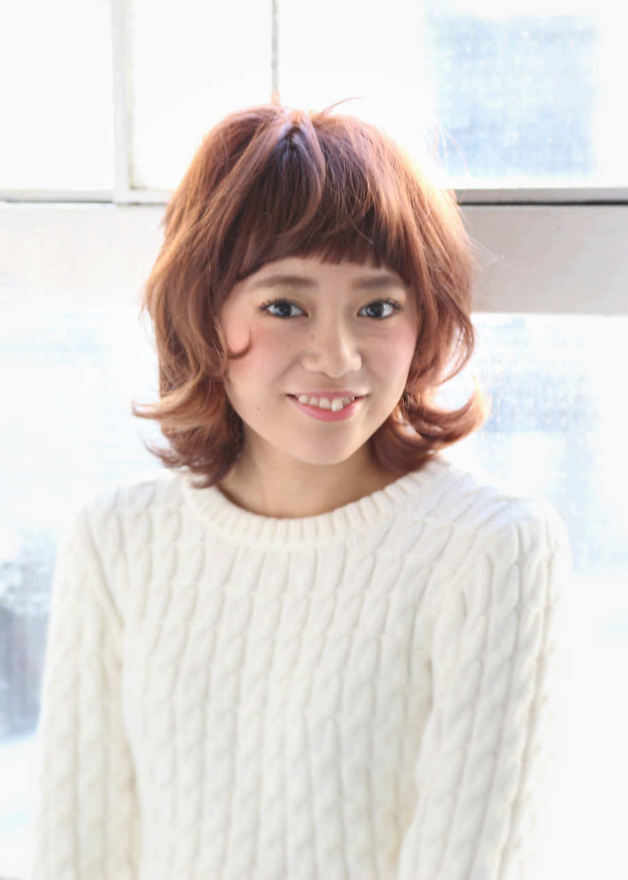 眉上キュートな前髪で可愛さアップ♪毛先をランダムにカールさせて柔らかい印象に。肩のラインはハネやすいですが、あえて外はねにカールさせて動きに。フェイスラインに動きの毛束で柔らかい印象に☆