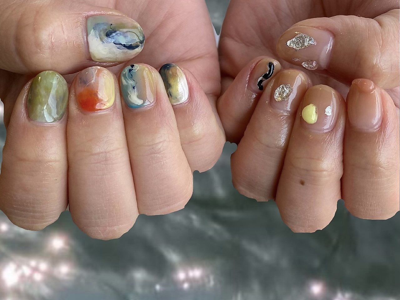 左右非対称で片手は派手に片手はクリアベースのシンプルデザイン