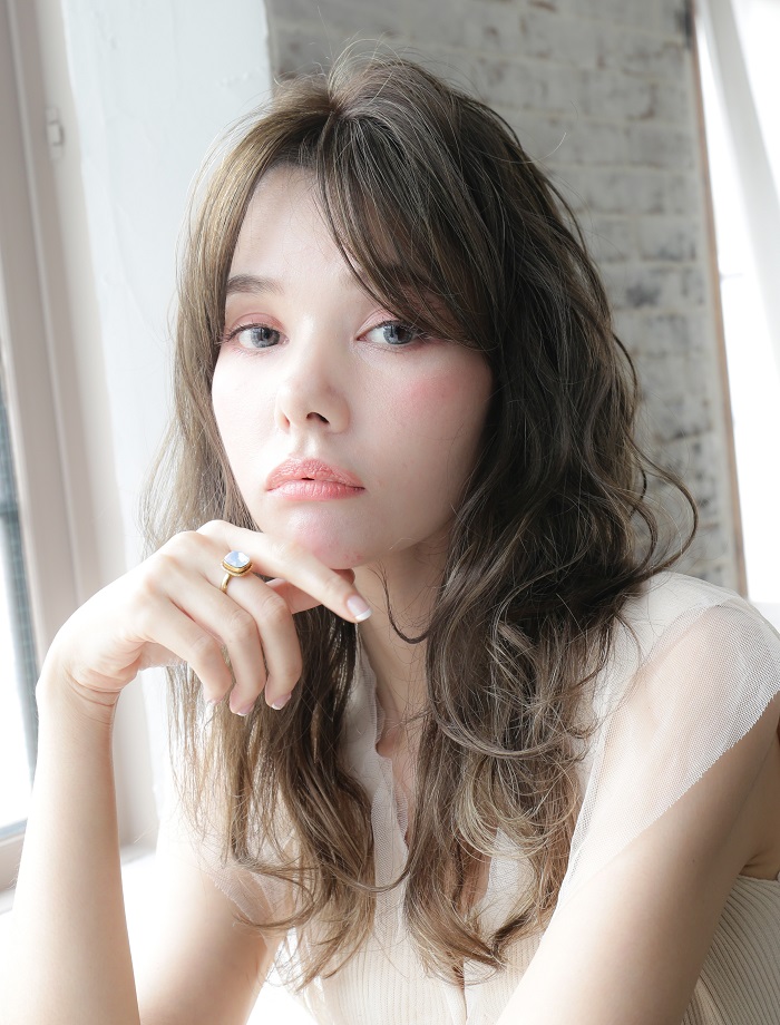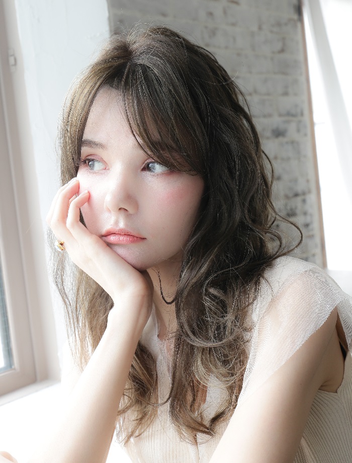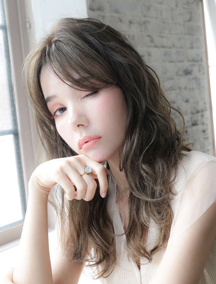 光に当たると透けるようなアッシュ系カラー。